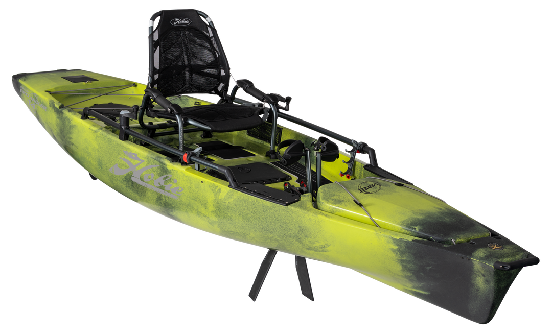 With the revolutionary MirageDrive 360 and Kick-Up fins, move through the water without constraints, going exactly where you want to go. Effortlessly spin and move in every direction. Hobie’s patented Kick-Up Fins immediately retract on impact – even shallow areas are now entirely navigable. Logs, kelp, shallows, rocks? No problem. The PA 12 is packed full of features including six rod holders, fully adjustable and ultra comfortable elevated Vantage ST seat with BOA lumbar support, Guardian retractable transducer shield, H-Rail for easy integration with accessories, front and center hatch with stain-resistant EVA grip pads, dual steering and extra wide hull for maximum stability.