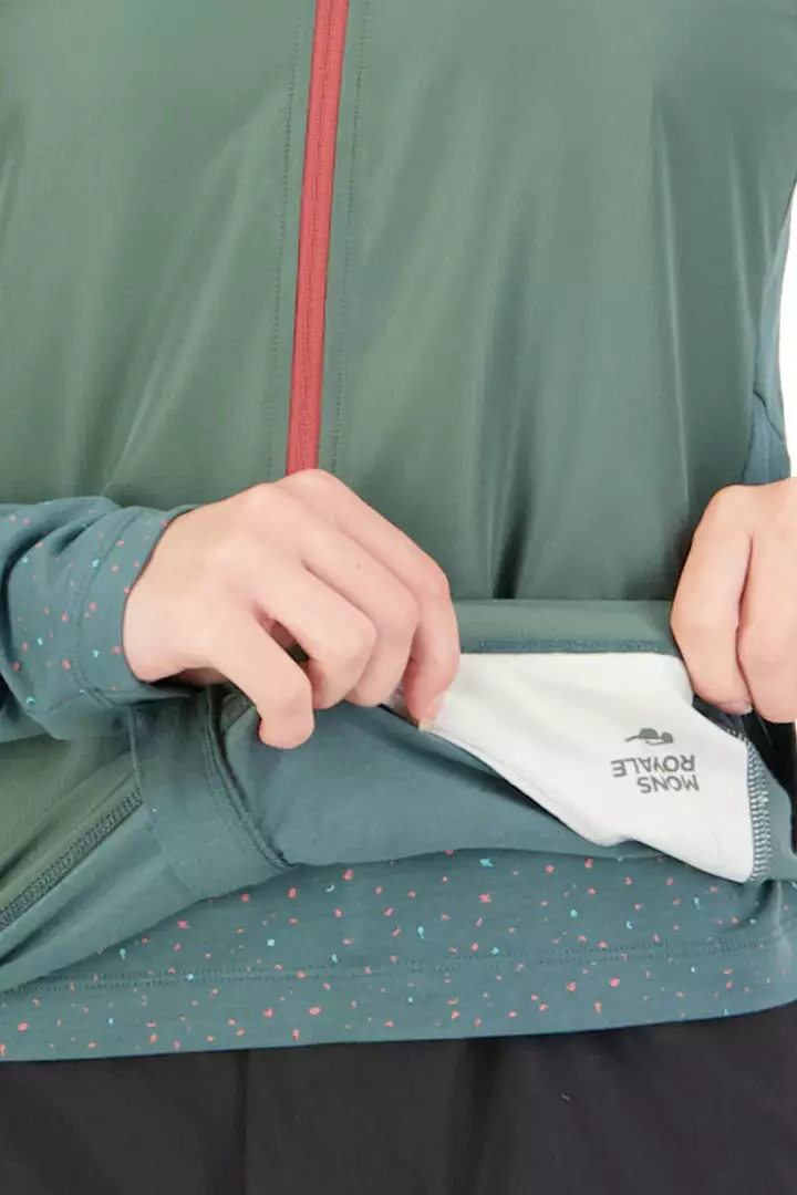 Using a ripstop polyester panel to protect the front of your body from wind chill and Merino Air-Con sleeves and back panel for breathability and temperature regulation.