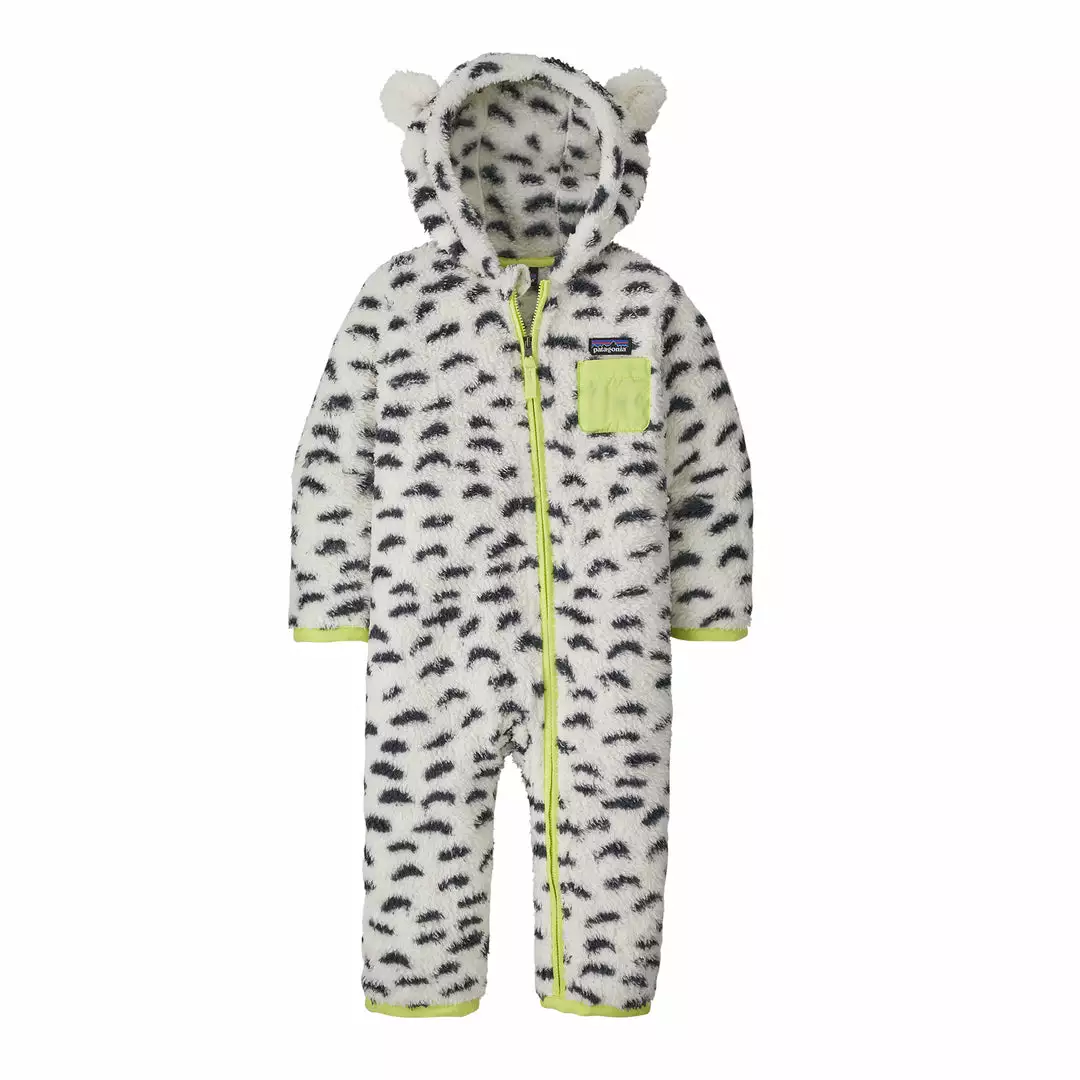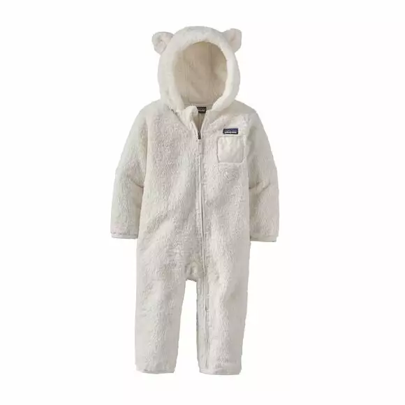 One-piece cozy bunting made of 100% recycled polyester high-pile fleece for cold-weather warmth. Three-panel hood; ears and tail animal styling plus a binky-sized chest pocket. Fair Trade Certified™ sewn.