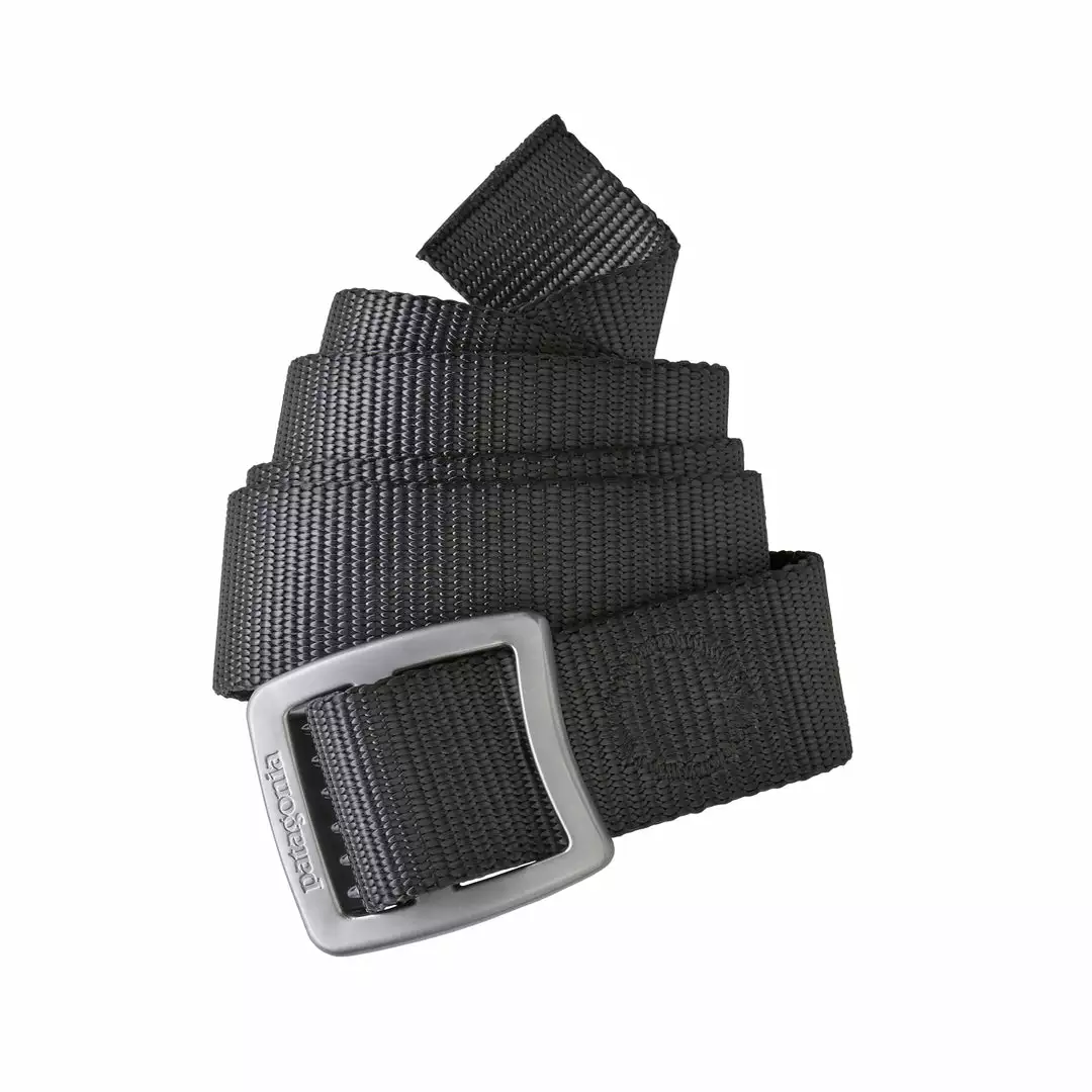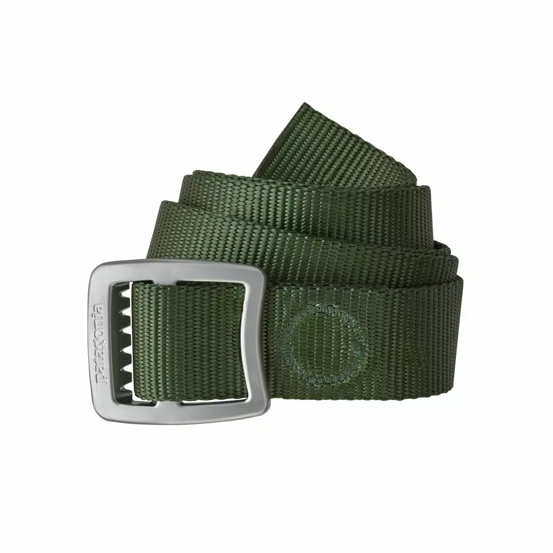 Burly, recycled nylon-webbing belt with an aluminum buckle can be used in a pinch as a lash strap or bottle opener.